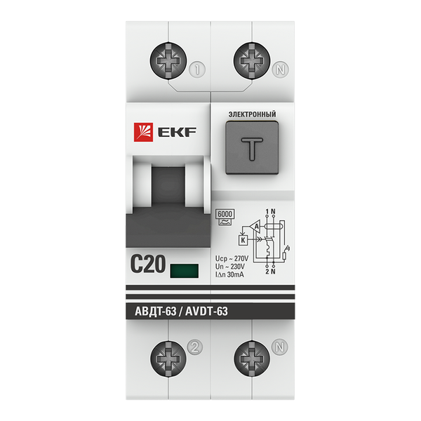 Автоматический выключатель дифференциального тока АВДТ-63 1P+N 20А характеристика C 30мА тип A электронный 6кА EKF PROXIMA