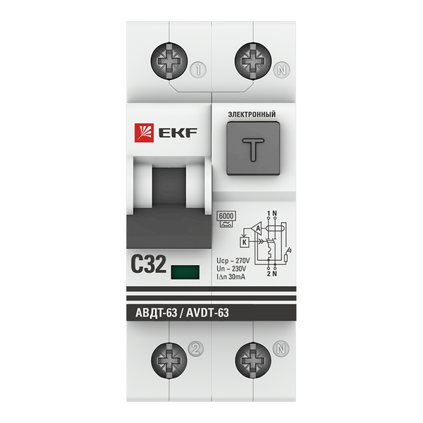 Автоматический выключатель дифференциального тока АВДТ-63 1P+N 32А характеристика C 30мА тип A электронный 6кА EKF PROXIMA