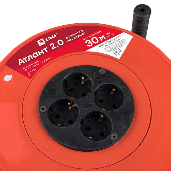 Удлинитель на катушке "Атлант 2.0" 4 гнезда 30м с заземлением ПВС 3*1,0 10А/2,2кВт PROxima