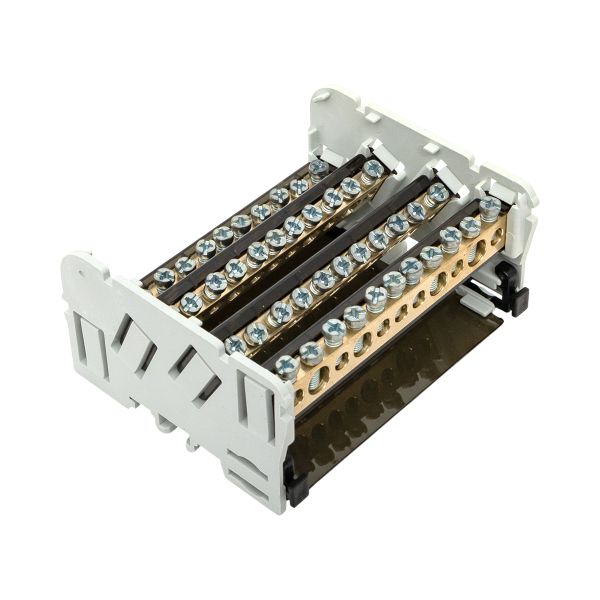 Кросс-модуль EKF — решение для щитового оборудования, предназначенное для подключения нулевых рабочих (N) и нулевых защитных (PE) проводников; допускается применение в качестве фазных проводников при соответствующем проектном решении. Усиленная защёлка на DIN-рейку обеспечивает надёжную фиксацию и быстрый монтаж без инструмента. Изменённое расположение шин в корпусе улучшает доступ к клеммам, ускоряет монтаж и упрощает укладку проводников в компактных щитах. Округлённые винты равномерно прижимают жилу и не перерезают проводник, повышая надёжность и ресурс соединений. Локализованное производство в России и адаптация к условиям эксплуатации на местном рынке. Оптимальный выбор для распределительных щитов, где важны безопасность, удобство монтажа и аккуратная коммутация.