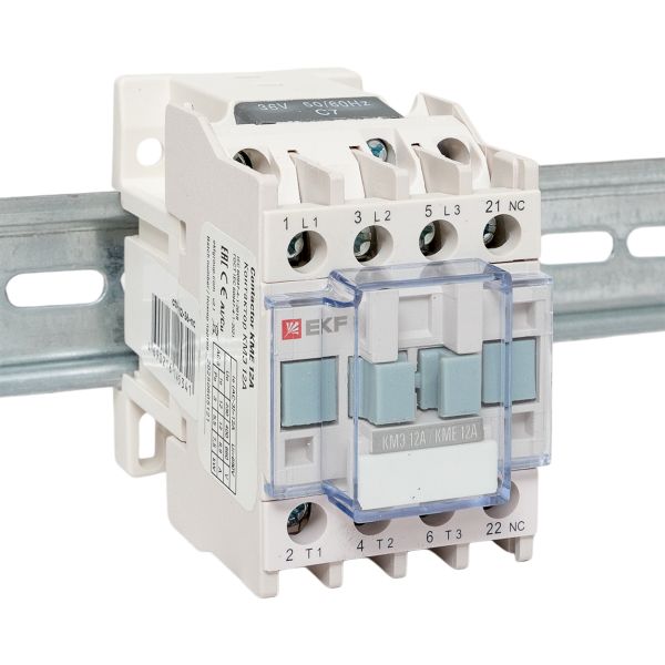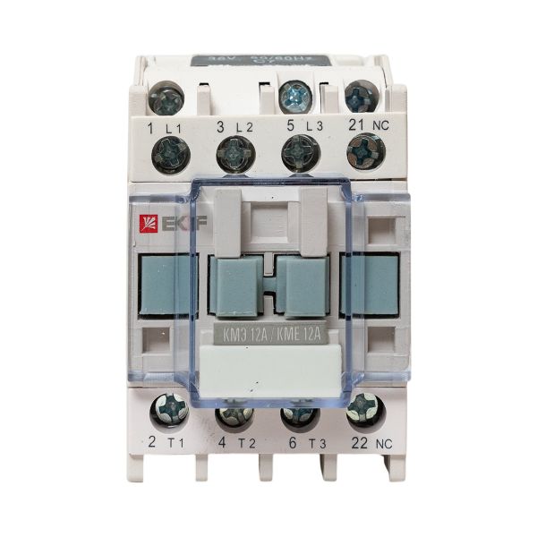 Контакторы КМЭ EKF PROxima состоят из корпуса, закрепленных в нем неподвижных контактов, подвижных контактов, которые закреплены в подвижной части магнитной системы. Неподвижная часть магнитной системы закреплена жестко в корпусе КМЭ. Пружина препятствует смыканию контактов. При подаче напряжения на катушку управления в магнитной системе контактора возникает магнитное поле, которое, преодолевая сопротивление пружины, смыкает магнитную систему и замыкает контакты. При отключении напряжения с катушки управления пружина размыкает контакты. Возможна коммутация алюминиевым и медным проводом.