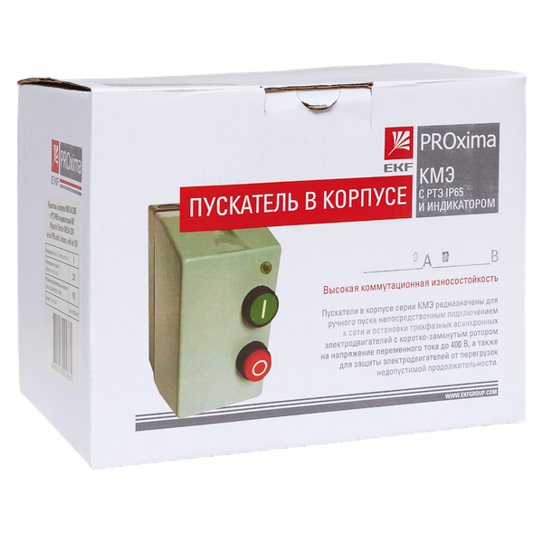 Пускатель магнитный КМЭ EKF PROxima является комплектным устройством, состоящим из малогабаритного контактора КМЭ, теплового реле РТЭ, оболочки с сальниками и кнопок управления. Пускатели предназначены для дистанционного пуска непосредственным подключением к сети и остановки трехфазных асинхронных электродвигателей с короткозамкнутым ротором на напряжение переменного тока до 400 В, а также для защиты электродвигателей от перегрузок недопустимой продолжительности и сверхтоков, возникающих при обрыве одной из фаз. При применении контакторов КМЭ 0910 – КМЭ 3210 используется пластиковый корпус, контакторов КМЭ 4011 – КМЭ 9511 – металлическая оболочка.