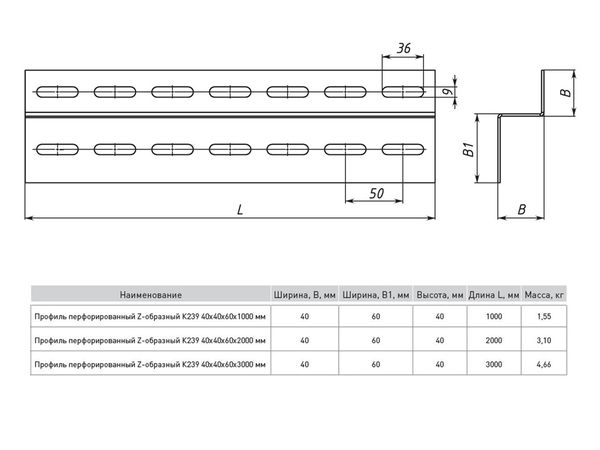 Профиль перфорированный Z-образный К239 40x60x1000 мм (2 мм) EKF