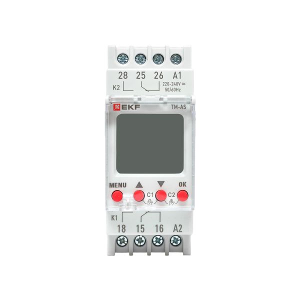 Таймер астрономический TM-AS EKF PROxima представляют собой реле с двумя независимыми группами контактов, момент срабатывания которого (включение/отключение) происходит по времени заката и восхода солнца на основании координат местоположения. Таймер имеет возможность срабатывания (80 программ) по заданному времени и дню недели. Таймер имеет в составе часы, что позволяет отслеживать текущее время.